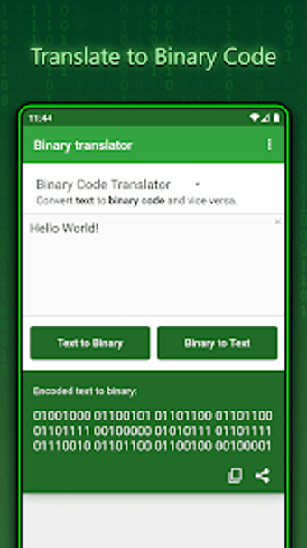 Binary Translator is a free Android app developed by QBit in the Utilities & Tools category. The app's purpose is simple - to translate text into binary code and vice versa. It also has the ability to convert numbers into binary, octal, and hexadecimal numeral systems. The app supports international characters in the UTF-8 format.